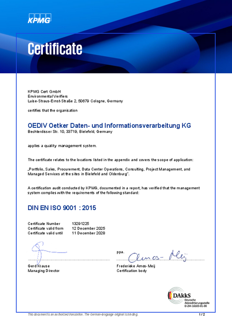 OEDIV has aligned its quality management system with DIN EN ISO 9001 and had it certified. Our quality policy defines the principles and values that guide our products, services, and processes in order to meet our customers' expectations.